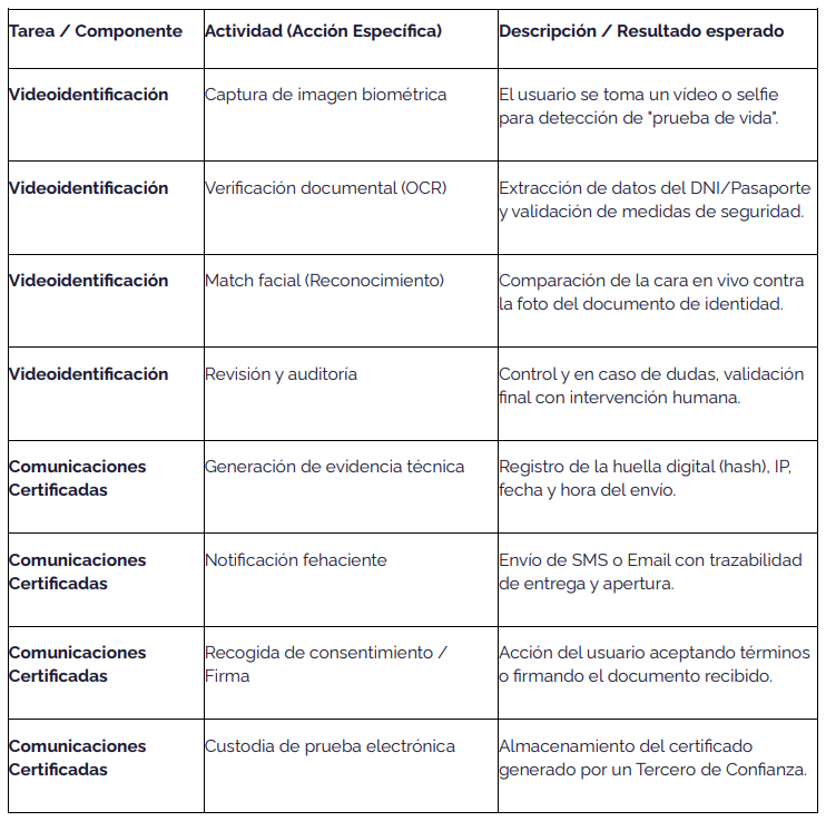 Mientras que en la tarea de Videoidentificación, las actividades buscan confirmar quién es la persona, en la tarea de Comunicaciones Certificadas, las actividades buscan demostrar qué se envió, cuándo y si se recibió.